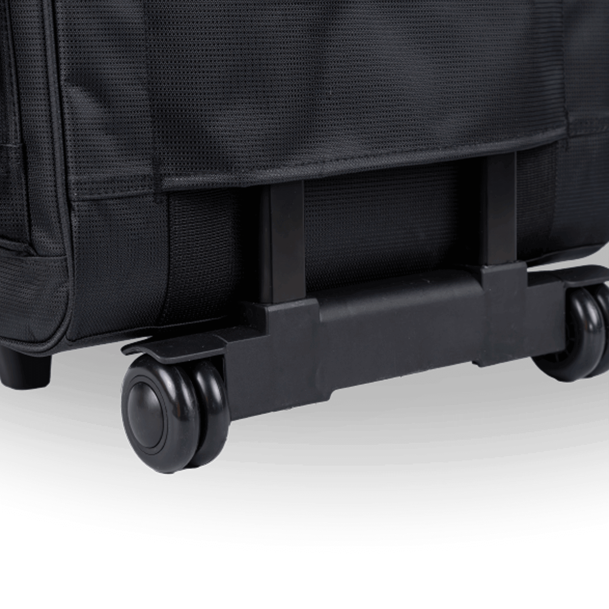 • komfortable Handhabung dank Rollen, zweistufig ausziehbarem Teleskopfgriff und seitlichen Tragegriffen
