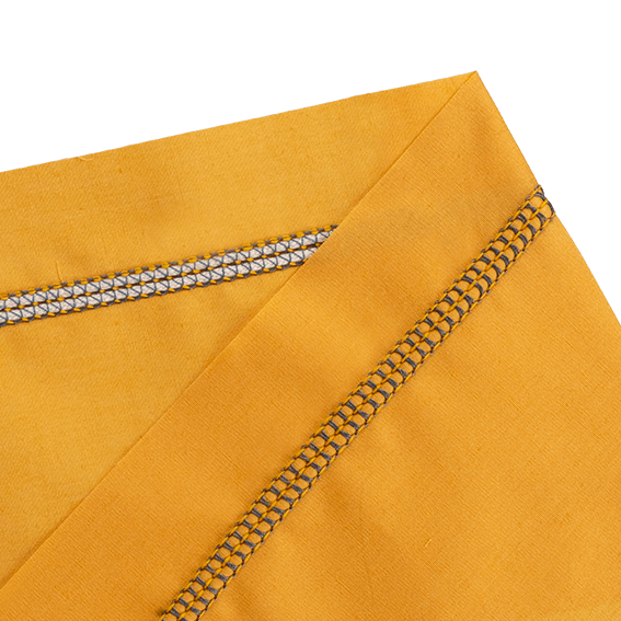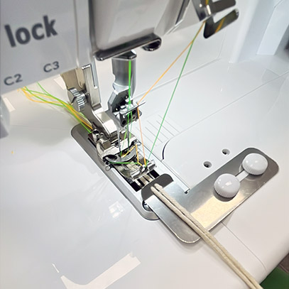 Die Kordelführung in Verbindung mit den Kordel-Einsätzen für den Primo Pendelfuß erzeugen eine plastische, biesenähnliche Zieroptik. Die Schnüren werden unter dem Stoff geführt. Außerdem verhindert die Kordelführung ein Verheddern der Schnüren.